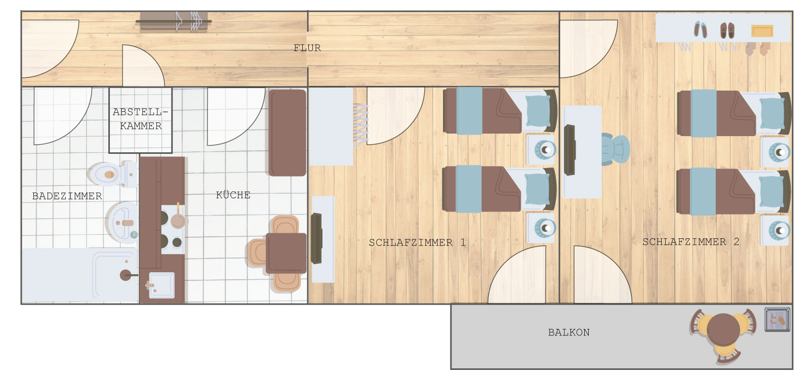 Die Wohnung verfügt über 4 Einzelbetten, die jeweils mit bequemen Matratzen ausgestattet sind. In der voll ausgestattete Küche finden Sie alles, was Sie benötigen, um ein köstliches Essen zu kochen. Eine Waschmaschine und ein Trockner stehen Ihnen ebenfalls zur Verfügung. Die Reinigung ist im Preis inbegriffen, so dass Sie sich um nichts kümmern müssen.